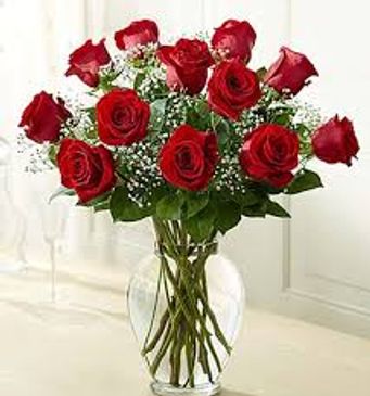 A bouquet of a dozen roses in a vase with Ribbon and a card. $70