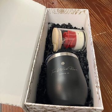 A gift set that comes in a beautiful box with a Wild Rose wine tumbler and candle. $25
