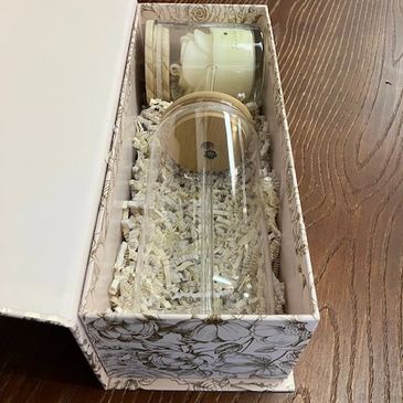 A gift set that comes in a beautiful box with a Wild Rose iced coffee cup and candle. $20