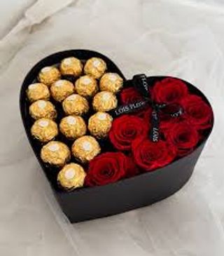 A heart shaped gift box filled with chocolates, a dozen roses and a card. $100