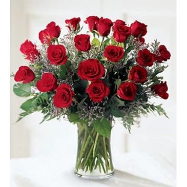 A bouquet of a dozen roses in a vase with Ribbon and a card. $70