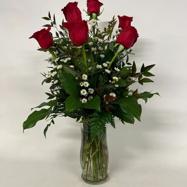 A bouquet of 1/2 dozen roses in a vase with ribbon and a card. $40